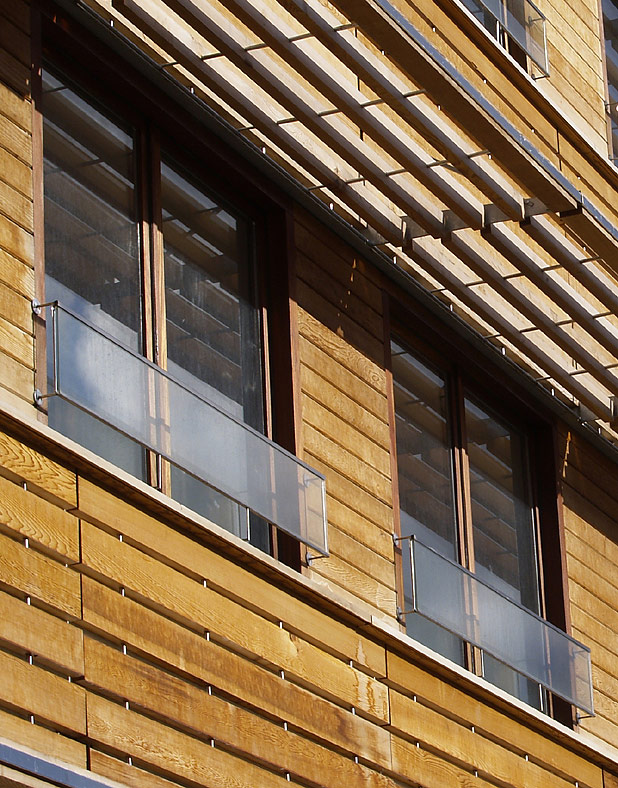 La fachada sur (de madera de bosques sostenibles) se estudió para que captara el sol de forma pasiva; tamaño de las ventanas, brisoleis, solado oscuro pétreo con gran inercia térmica.