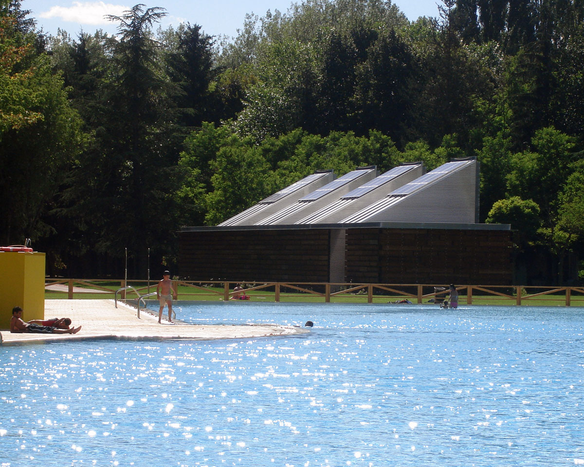 El nuevo edificio bioclimático para instalaciones se realiza junto al camino principal, el gran paseo que une la entrada con las piscinas, y cerca de las piscinas. De esta manera conseguimos que sea accesible a la carga y descarga de los productos químicos, además de alejarla de la zona inundable.